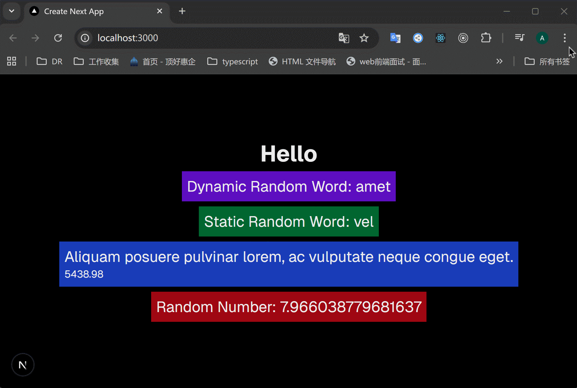 xxxxxxxxxx161// src/app/page.tsx23export default async function Home() {4 const randomWord = await fetch("https://api.api-ninjas.com/v1/randomword", {5 headers: {6 "X-Api-Key": "a7W2X5UV2SO2p1rcJNNOPw==4PUAhX4EIcCzDbrx", // 需要去 https://api-ninjas.com 免费注册拿 key7 },8 }).then((r) => r.json());9 console.log("Home Component Ran");1011 return (12 <div className="flex flex-col min-h-screen items-center justify-center bg-zinc-50 font-sans dark:bg-black">13 <h1 className="text-4xl font-bold">{randomWord.word[0]}</h1>14 </div>15 );16}在开发环境,是每次刷新都会请求数据: