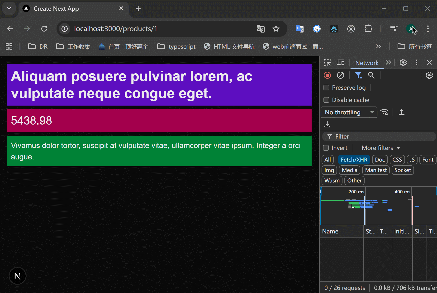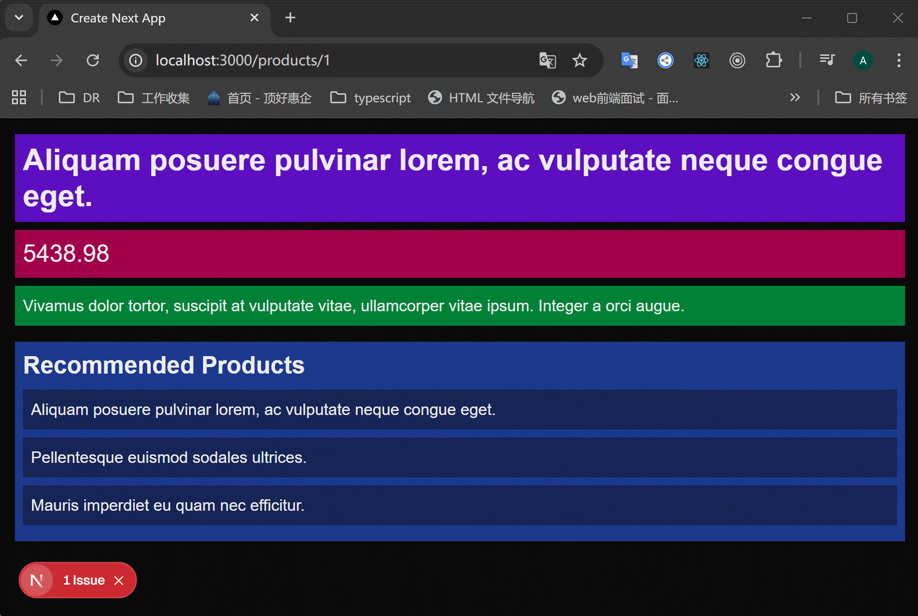 xxxxxxxxxx401import { db } from "@/db/drizzle";2import { getProduct, getRecommendedProducts } from "./utils";3import { products } from "@/db/schema";45export default async function Page({6 params,7}: {8 params: Promise<{ id: string }>;9}) {10 const { id } = await params;11 const product = await getProduct(+id);12 const recommendedProducts = await getRecommendedProducts();13 return (14 <div className="p-4">15 <h1 className="text-3xl bg-violet-800 mb-2 font-bold p-2">16 {product.title}17 </h1>18 <p className="text-2xl bg-pink-800 p-2 mb-2 font-medium">19 {product.price}20 </p>21 <p className="font-lg bg-green-700 p-2 mb-2">{product.description}</p>22 <div className="bg-blue-900 p-2 mt-4">23 <h2 className="font-bold text-2xl mb-2">Recommended Products</h2>24 <ul>25 {recommendedProducts.map((recommendedProduct) => (26 <li key={recommendedProduct.id} className="p-2 mb-2 bg-blue-950">27 {recommendedProduct.title}28 </li>29 ))}30 </ul>31 </div>32 </div>33 );34}3536// 在构建时(build time)提前告诉 Next.js 要为哪些动态参数生成静态页面。这里是选了5个。37export async function generateStaticParams() {38 const ids = await db.select({ id: products.id }).from(products).limit(5);39 return ids.map(({ id }) => ({ id: id.toString() }));40}可以看到,正常了,渲染速度是非常快的。