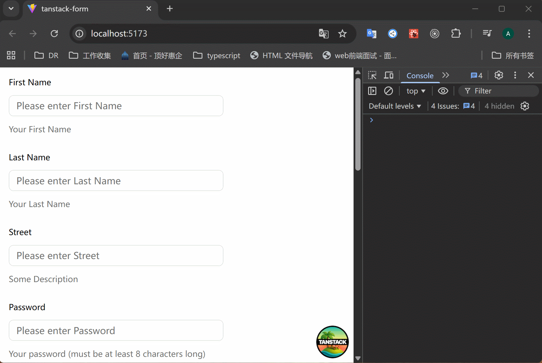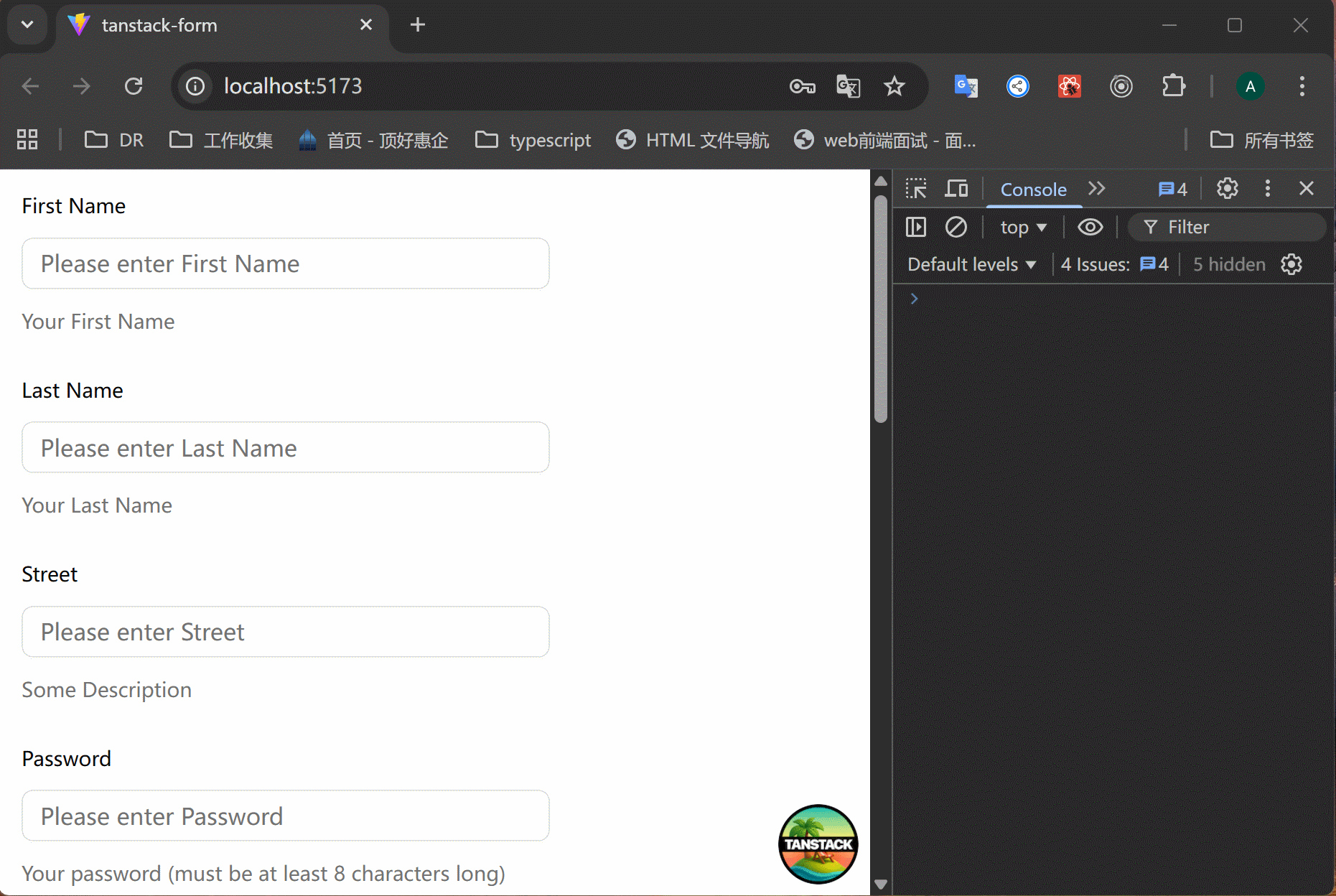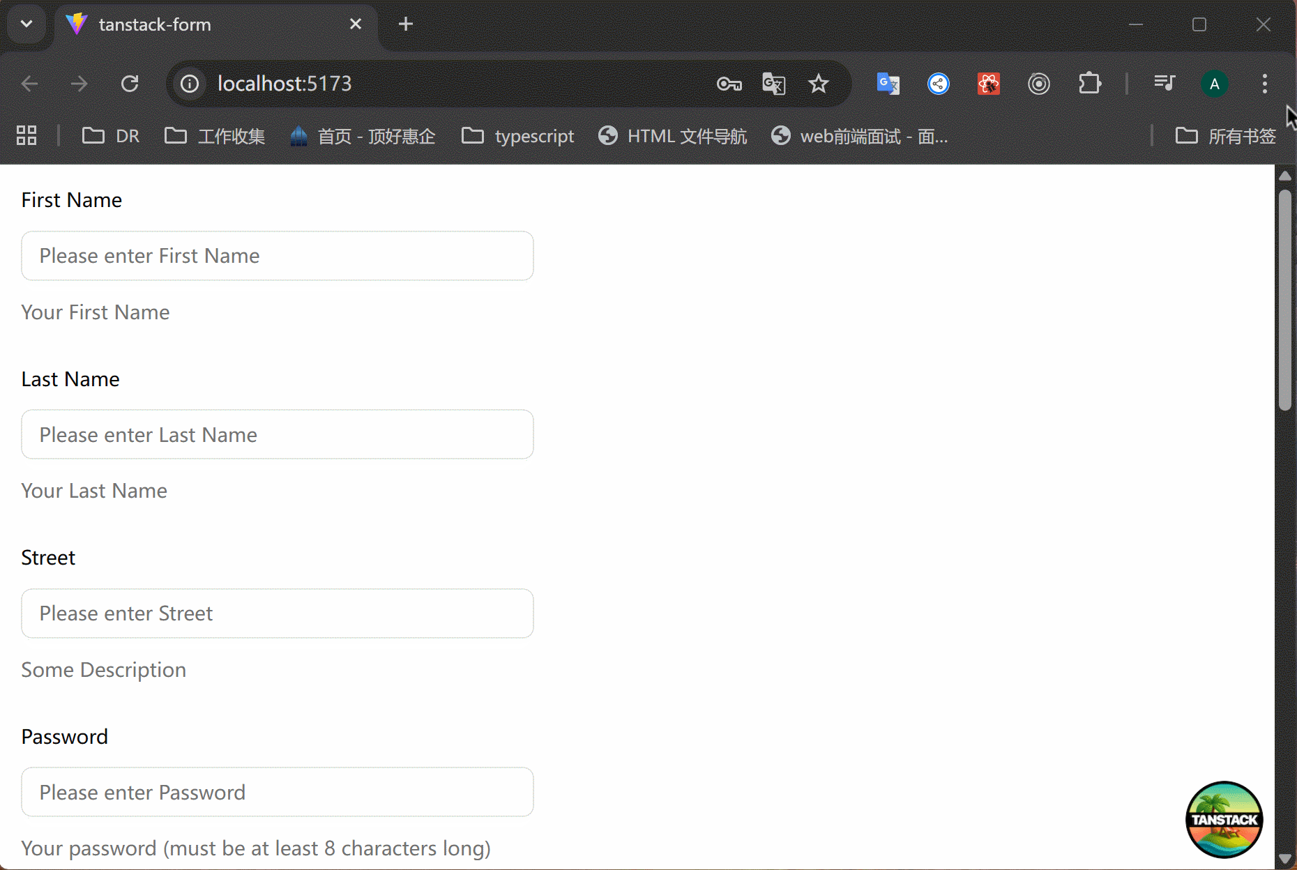 xxxxxxxxxx161// src/lib/register-form/RegisterForm.tsx23<form.AppForm>4 <form5 onSubmit={(e) => {6 e.preventDefault();7 form.handleSubmit({ key: "value" });8 }}>9 <FieldGroup>10 ......11 </FieldGroup>12 13 {/* 可以看到,使用起来非常简单 */}14 <form.SubmitButton />15 </form>16</form.AppForm>可以看到,界面正常,交互正常。