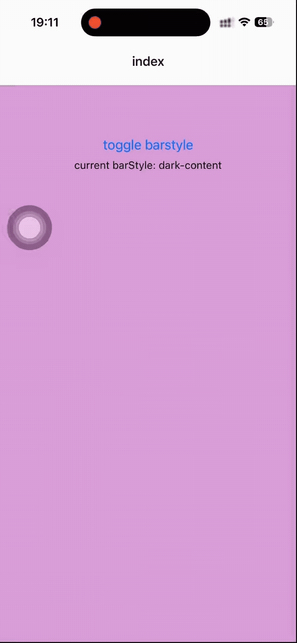 xxxxxxxxxx241// app/index.tsx23import { useState } from 'react'4import { View, StatusBar, Button, StatusBarStyle, Text } from 'react-native'56export default function Index() {7 const [step, setStep] = useState(0)8 const arr: StatusBarStyle[] = ['default', 'light-content', 'dark-content'];9 const toggleBarStyle = () => {10 if(step === 2) {11 setStep(0)12 } else {13 setStep(step+1)14 }15 }1617 return <View style={{ flex: 1, backgroundColor: "plum", padding: 60 }}>18 <StatusBar backgroundColor="lightgreen" barStyle={arr[step]} />19 <Button title="toggle barstyle" onPress={toggleBarStyle} />20 <Text style={{textAlign: "center"}}>21 current barStyle: {arr[step]}22 </Text>23 </View>24}上面的代码是我根据学习的内容写的,还是比较简单的,就是来切换barStyle查看效果: